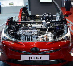 众所周知,普锐斯(Prius)是丰田汽车公司的第一款混合动力车型,自1997年问世以来,至今销量累计已超过300万台。此次展出模型的是丰田新款的普锐斯,搭载有捷太格特引以为傲的产品:ECU电机一体化的新型C-EPS(管柱式电动助力转向器)、驱动轴CVJ、轮毂单元及各种轴承产品,具备低扭矩、小型化、低油耗等优点,为成就人气车型普锐斯立下汗马功劳。除了普锐斯,丰田汽车的Plug-in HEV(插电式混合动力车),FCV(燃料电池车)等也同样使用了捷太格特的EPS、轴承等产品。