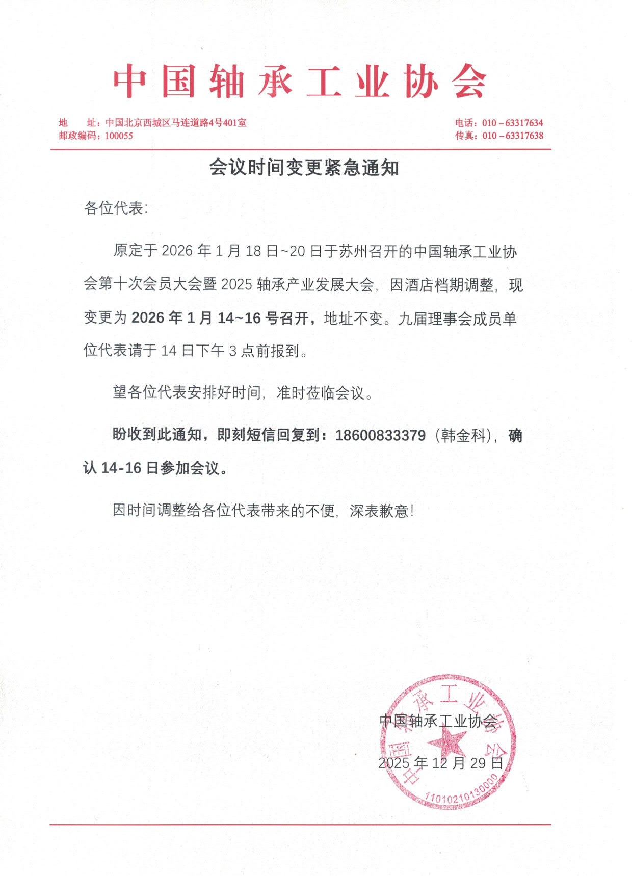 会议时间变更紧急通知2025-12-29来源:中国轴承工业协会