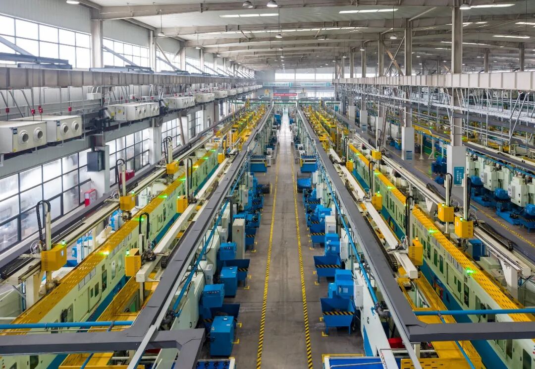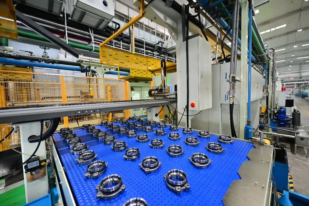 一万平方米车间内,四条产线一字排开,龙门架机器人在头顶划出流畅弧线,精准抓取、搬运零部件。热处理、车加工、磨加工、装配……每条产线上,8台机械臂、2套桁架机器人、2套龙门架机器人协同作业,数十道工序几乎全部自动化。这个去年5月全面投产的新能源汽车轴承基地,此刻已进入生产“满格”状态。